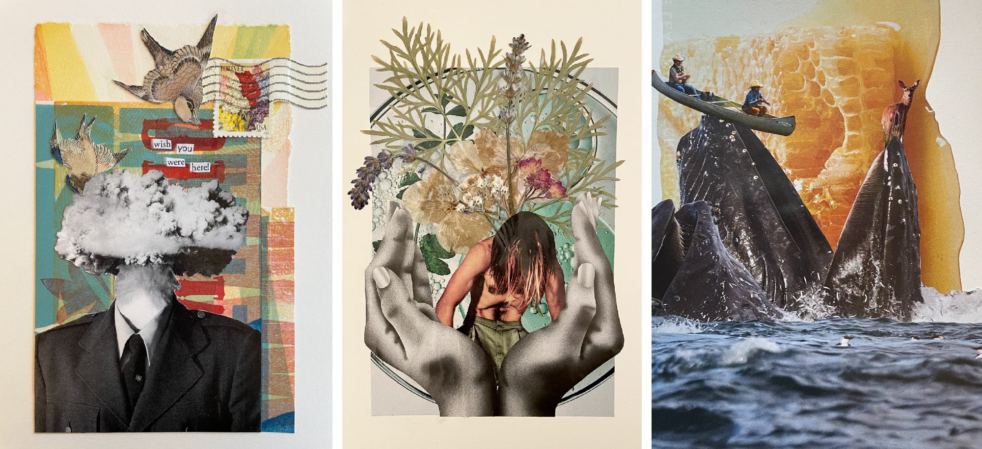 I love the collages. There is an visual idea in all three that I cannot describe (it is foreign to me). So hope you do more and develop your ideas further.